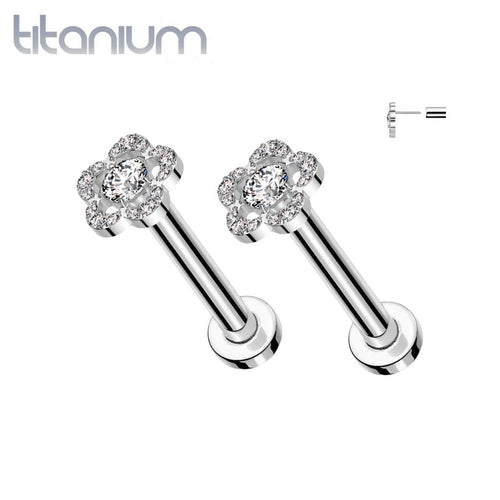 Pair of Implant Grade Titanium Threadless White CZ Flower Earring Studs with Flat Back