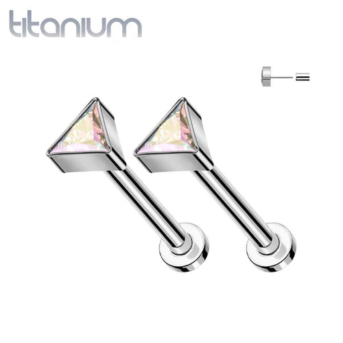 Pair of Implant Grade Titanium Aurora Borealis CZ Triangle Threadless Push In Earrings With Flat Back