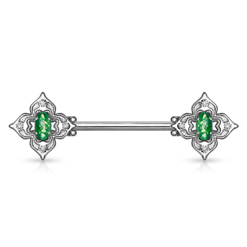 316L Surgical Steel 4 Petal Design White CZ & Dark Green Opal Nipple Ring Straight Barbell