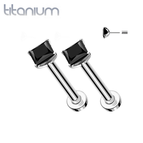 Pair of Implant Grade Titanium Threadless Square Black CZ Gem Earring Studs with Flat Back