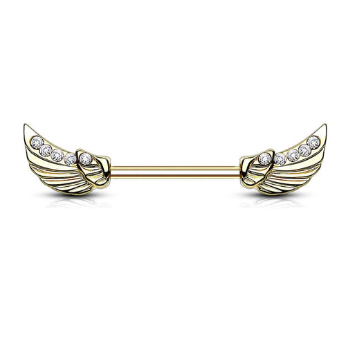 Gold Plated Surgical Steel Wing Nipple Ring with White Gems